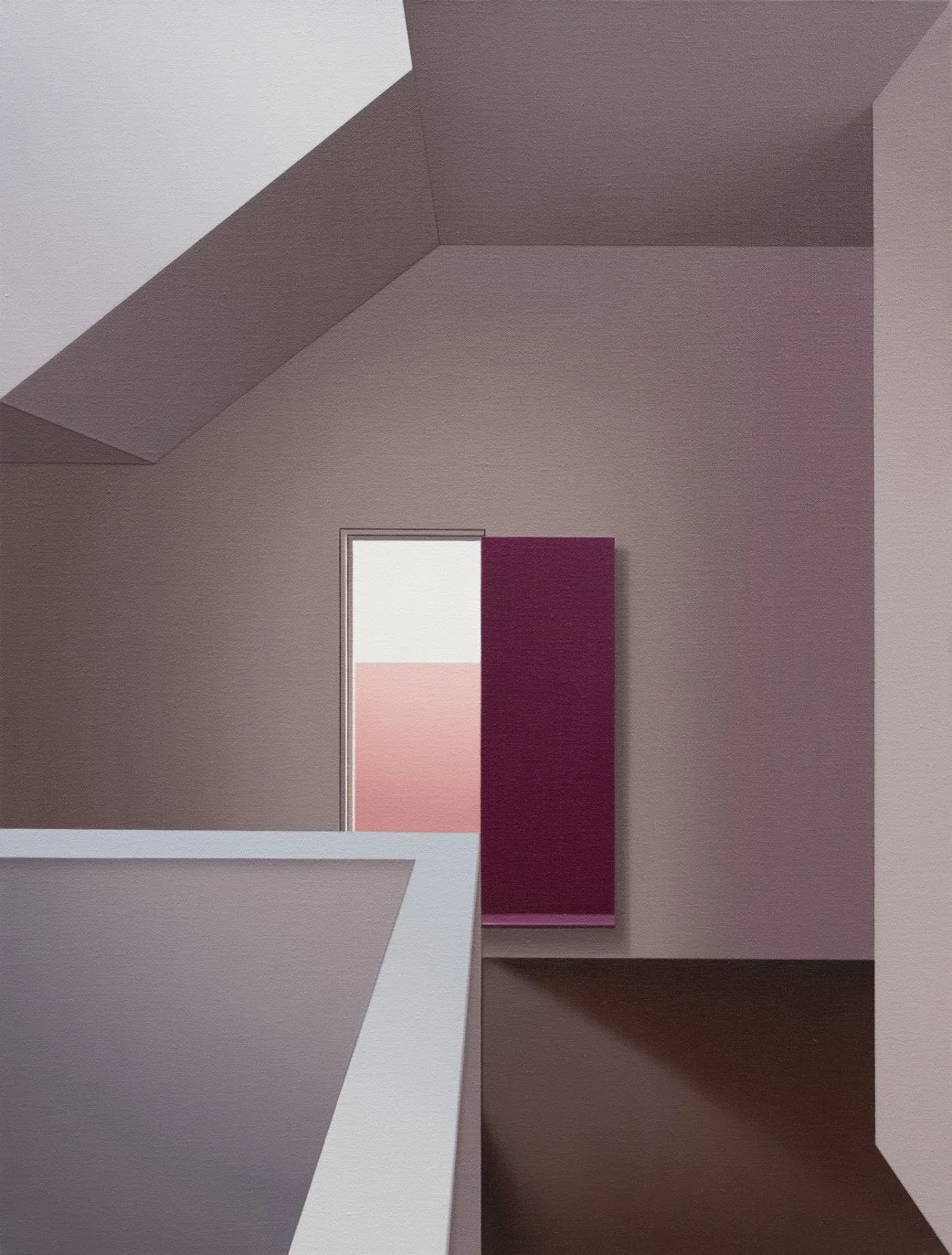 Cette exposition constitue la deuxième partie d’une série de peintures sur laquelle je travaille depuis 2023. La première partie a été présentée à la galerie Blouin Division à Montréal il y a deux ans. La série est née de deux voyages que j’ai effectués au Mexique : le premier en février 2020, juste avant la pandémie de COVID, et le second en 2024. C’est là que j’ai découvert l’architecture moderne mexicaine, d’abord par l’hôtel où je séjournais lors des deux voyages — le Camino Real, conçu par Ricardo Legorreta — puis en visitant trois résidences conçues par Luis Barragán : la Casa Barragán, la Casa Gilardi et la Casa Pedregal.